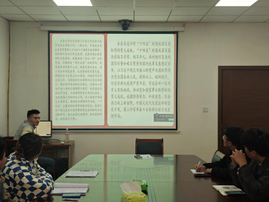 首先,学生党支部书记陈博带领全体党员学习了《中国共产党第二十届中央委员会第四次全体会议公报》核心内容,重点解读“高水平科技自立自强”“文化传承创新”等与青年紧密相关的内容,结合解读短视频的可视化呈现,帮助大家快速把握全会精神的时代内涵与实践要求,筑牢理论根基。在交流讨论环节,刘佳鑫、谷昊晔等6名学生党员围绕“全会精神与青年担当”展开热烈讨论。
