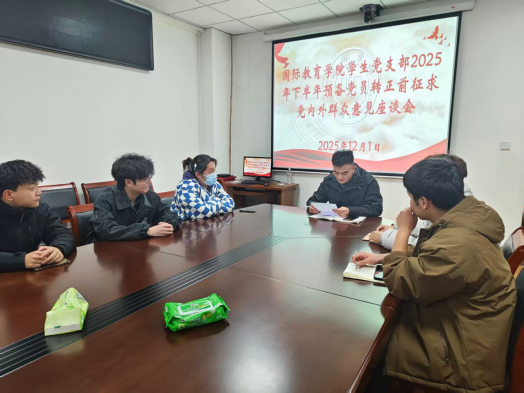 12月1日上午,为严格落实党员发展程序,充分听取党员和群众意见,国际教育学院学生党支部在A04-104党员活动室召开2025年下半年预备党员转正前党内外群众意见座谈会,对李舒等7名预备党员能否按期转正征求意见。会议由学生党支部书记陈博主持,党员代表与群众代表参会。
